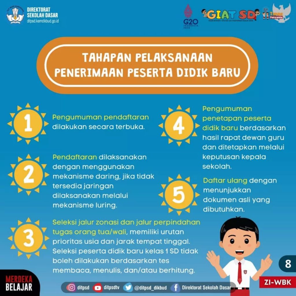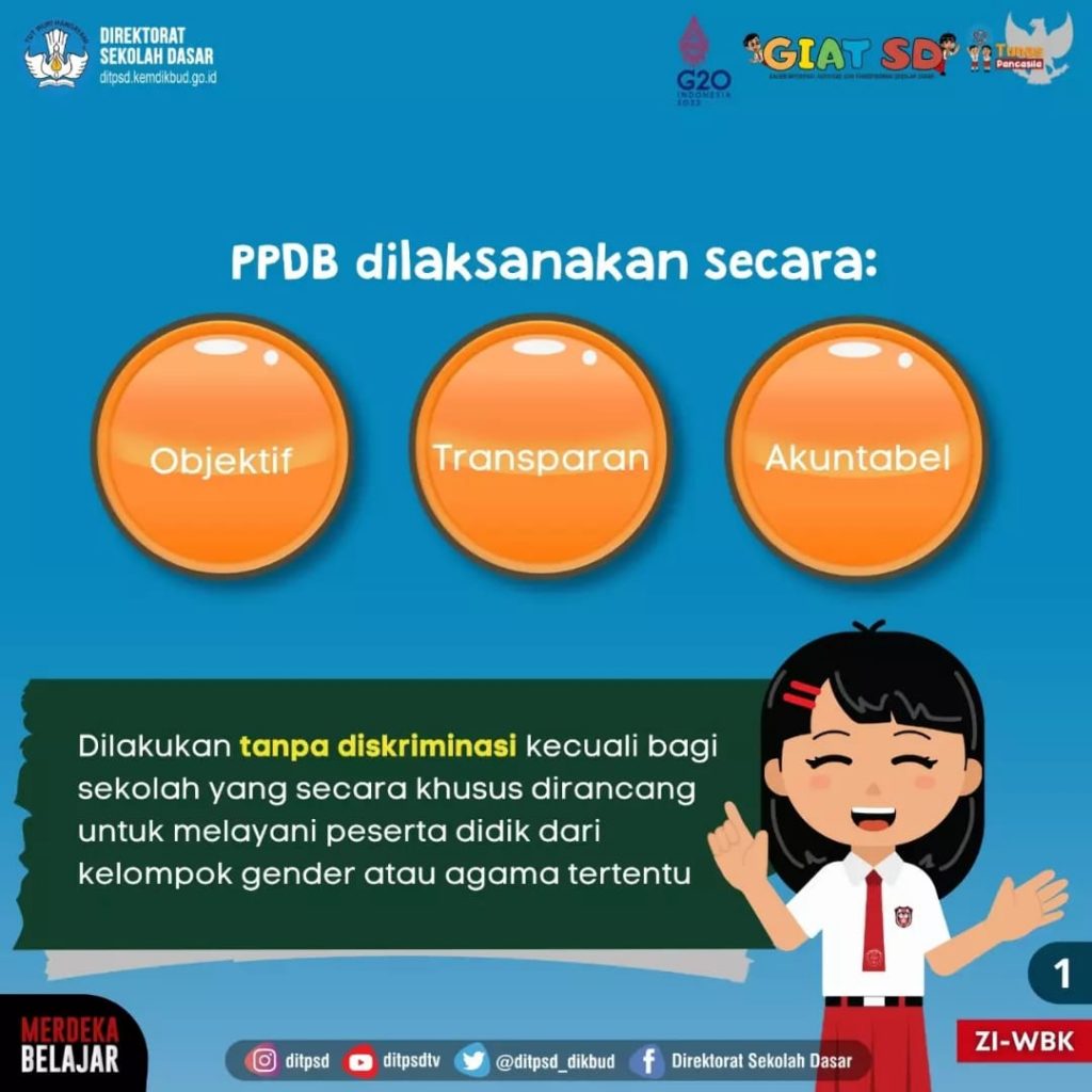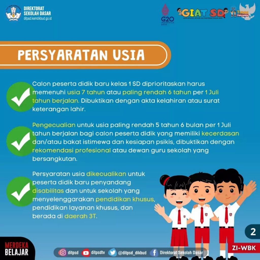 1. Calon peserta didik baru kelas 1 SD diprioritaskan harus memenuhi usia 7 tahun atau paling rendah 6 tahun per 1 Juli tahun berjalan. Dibuktikan dengan akta kelahiran atau surat keterangan lahir.