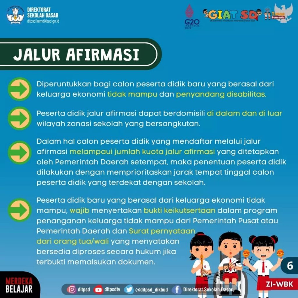 Sementara jalur afirmasi paling sedikit menampung 15% dari daya tampung sekolah untuk menerimas calon siswa baru. Hal-hal yang harus Bunda perhatikan jika ingin memasukkan anak ke sekolah dasar melalui jalur afirmasi: